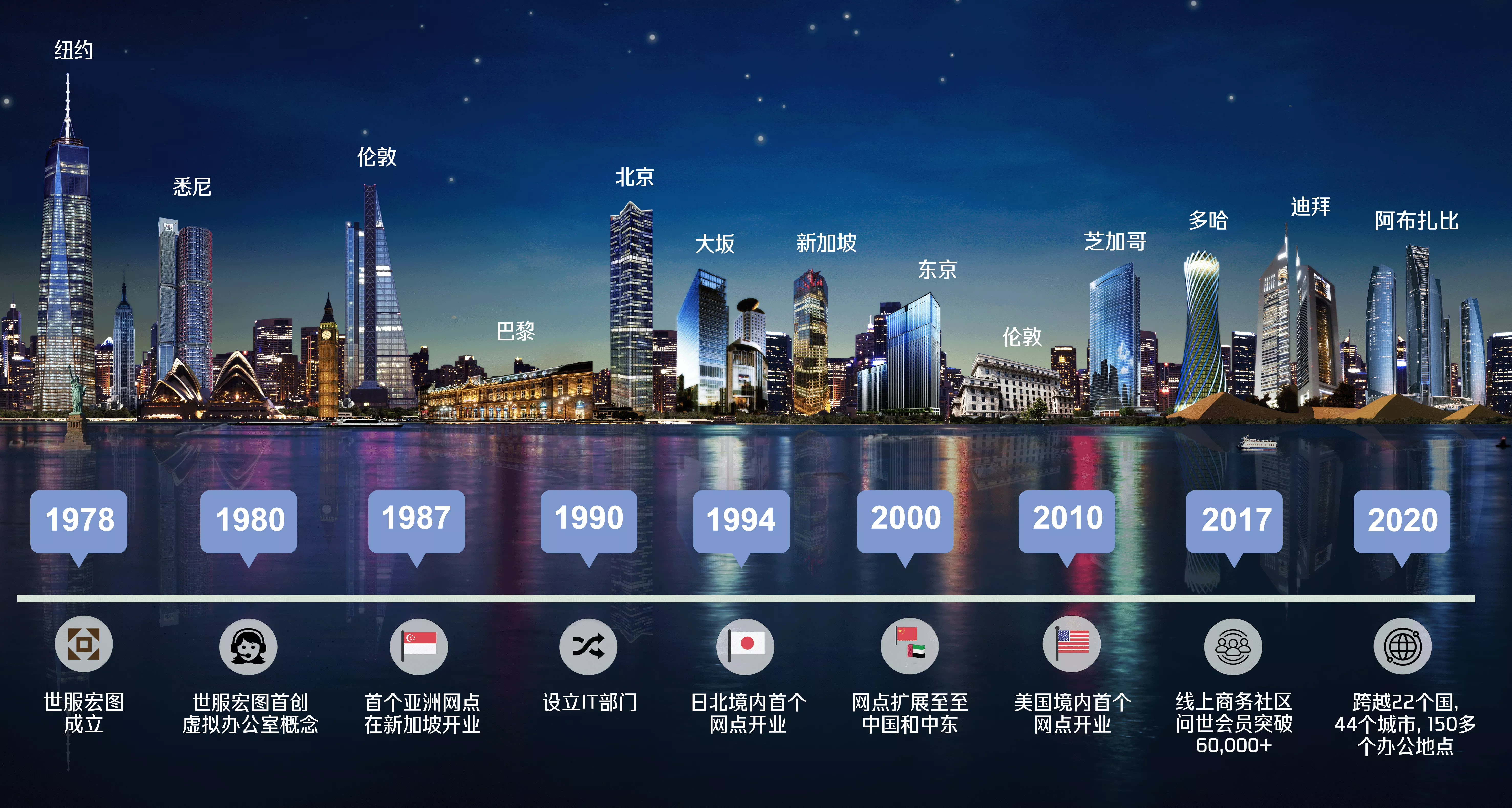 公司创始人兼首席执行官 Alf Moufarrige 先生于1978 年在澳大利亚悉尼注册并成立世服宏图。作为服务式办公室和虚拟办公室行业的开拓者,他在灵活办公领域深耕逾 45 年。值得一提的是,世服宏图正是 30 多年前虚拟办公室的发源地。公司自1987年起走向全球,目前已在全球 19 个国家、40 个城市设有 150 多个办公地点。